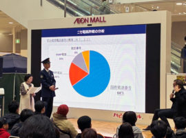 もし越谷レイクタウンで地震に遭遇した際には、レイクタウンから「避難訓練を定期的に実施しているので、慌てることなく従業員の指示に従ってください」、火災の場合は越谷市消防局の方より「煙に巻かれて亡くなる人もいまなすので、姿勢を低くして、口をハンカチなどで押させてください」との説明がありました。